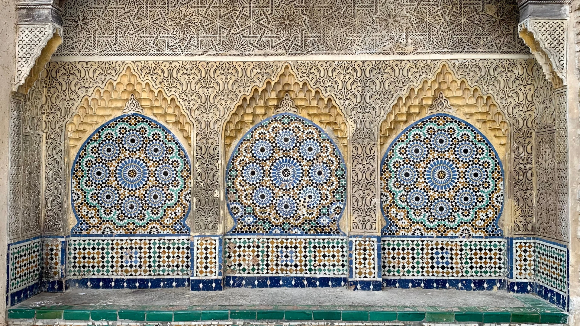 Le zellige, dérivé du mot arabe 'al zulaycha' signifiant 'petite pierre polie', est apparu au Xe siècle sous la dynastie Idrisside. Ce qui avait commencé comme une solution pratique pour l'étanchéité est devenu l’un des arts décoratifs les plus raffinés du monde. L’âge d’or du zellige survient au XIVe siècle sous les Mérinides, lorsque la complexité géométrique et la palette de couleurs atteignent un sommet artistique.